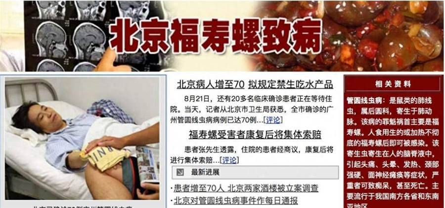 這里提一下曾經轟動一時的北京福壽螺事件。2006年5月,一家飯館為了降低成本,用便宜的福壽螺冒充海螺,導致160多人出現低燒,惡心,抽搐,面癱等癥狀。