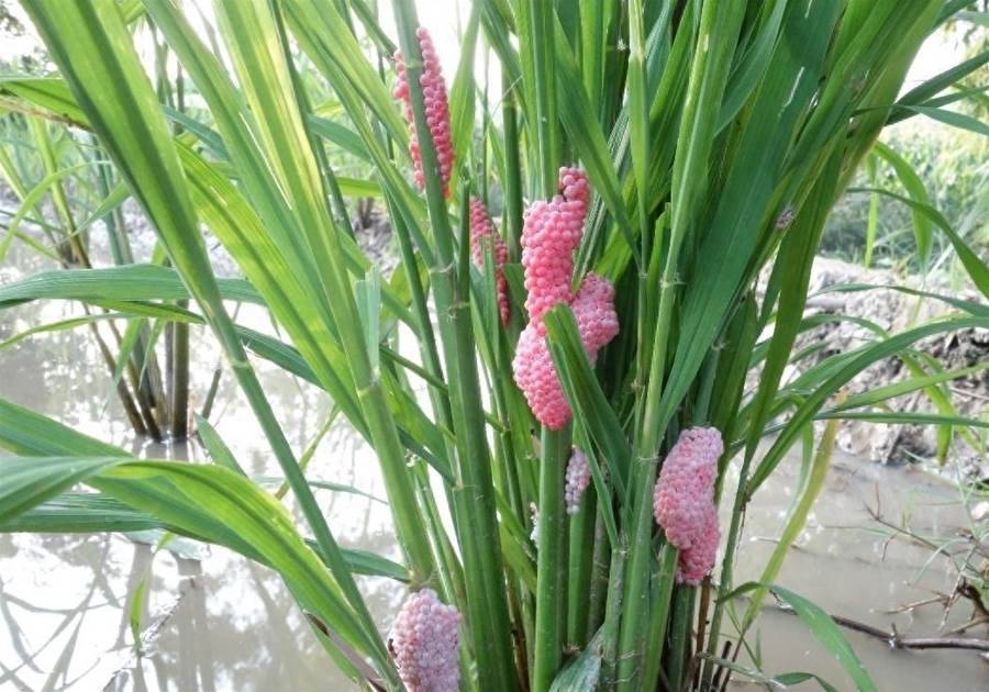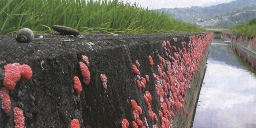 福壽螺產卵量大,紅色的卵在一起就像一朵小紅花,當紅花盛開,成熟的福壽螺就會侵占著當地資源,擠壓著蝸牛等其他小型動物。
