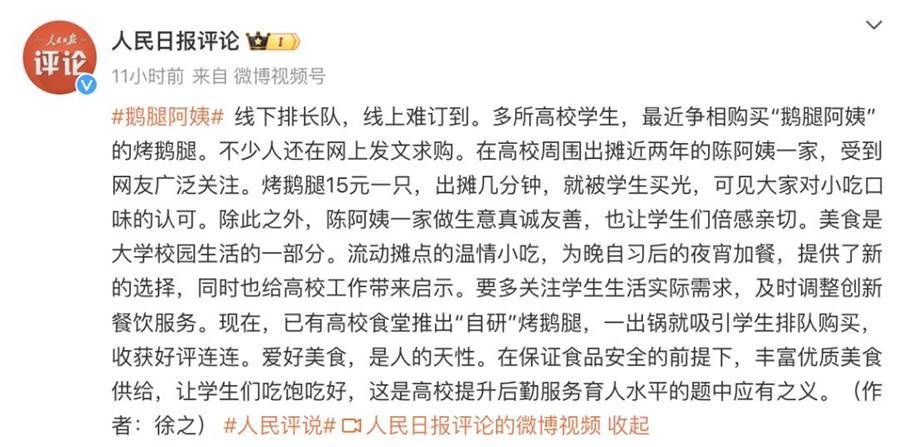 值得夸贊的是,在了解到學生的需求后,中國人民大學立即自主研發了烤鵝腿,并宣布每天下午在食堂售賣。