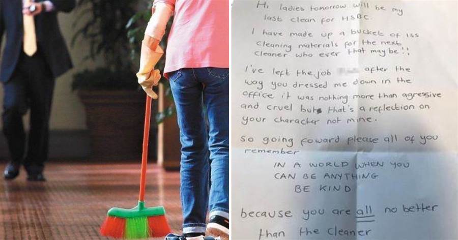 雖然很多人嘴巴上說著「職業不分貴賤」,但心裡可不見得真的這麼認為!最近有位一位任職清潔人員長達35年的婦人,因為長期受到經理的刁難與輕視,最近決定退休後便寫了一封信給公司的經理,而信中的內容被傳到網路後,更是因為寫出許多人的心聲爆紅,獲得廣大網友的讚賞與支持!