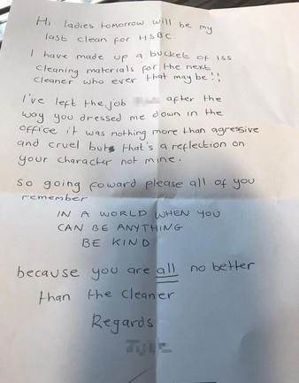 對於自己的信件意外的爆紅,這位退休的清潔婦人也表示,若自己就這樣安安靜靜地吞忍離開,這位長期言語霸淩別人的經理恐怕不會知道自己的言行有很大的問題,並使得接任的清潔人員繼續受到這樣的精神殘害,因此才決定離開前打開天窗說亮話,把對方不合理的行徑給直接點出來!